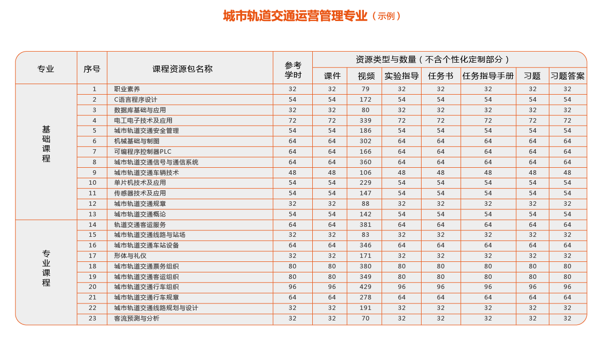 1.建设课程资源,支撑专业建设发展与人才培养需要。支撑专业覆盖城市轨道交通通信信号技术、机电技术、运营管理、车辆技术,对标专业培养目标岗位群,针对专业涉及岗位完成典型工作任务所需能力训练需求组织实训,研发配套课程资源。