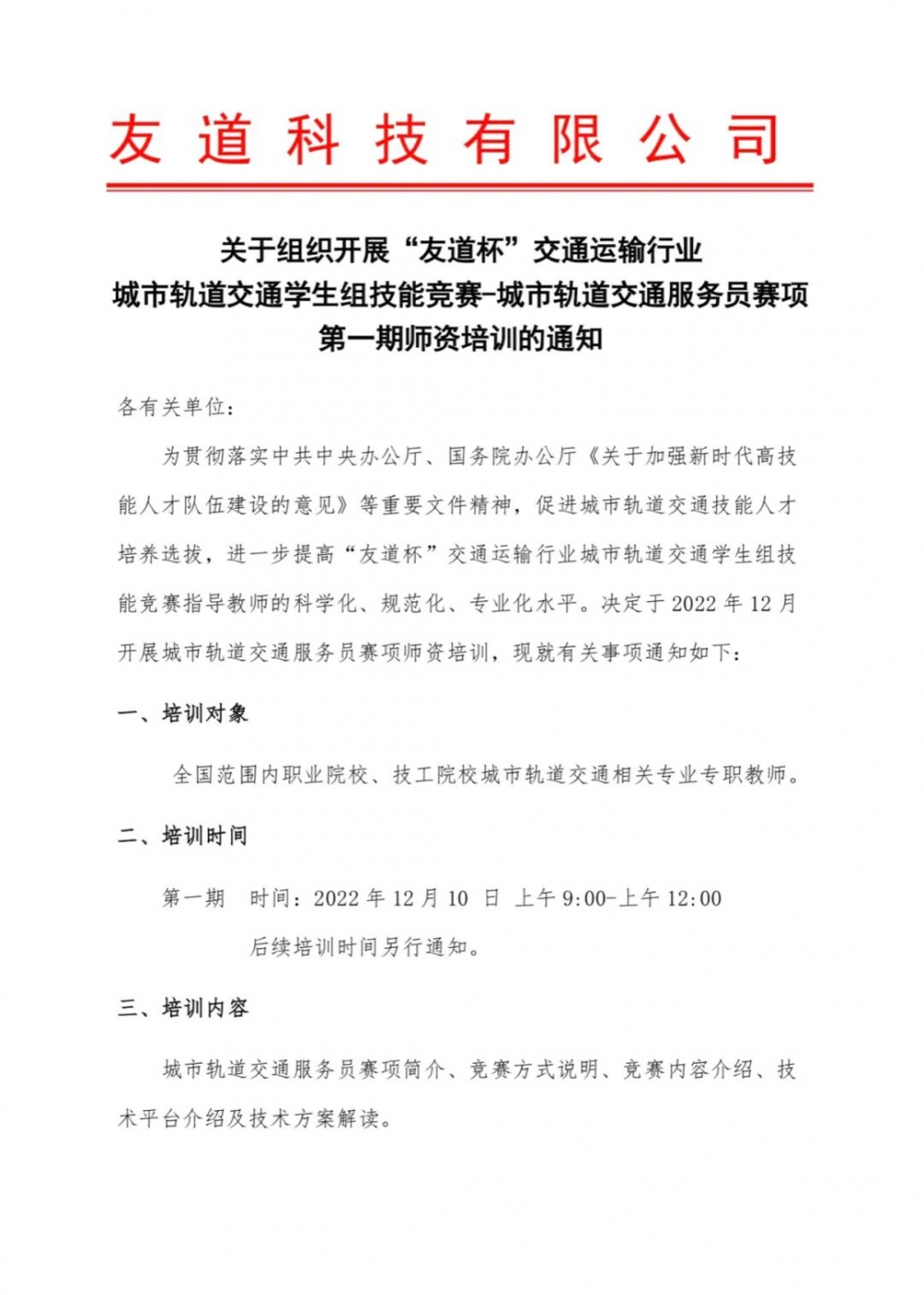 关于组织开展“友道杯”交通运输行业城市轨道交通学生组技能竞赛-城市轨道交通服务员赛项第一期师资培训通知