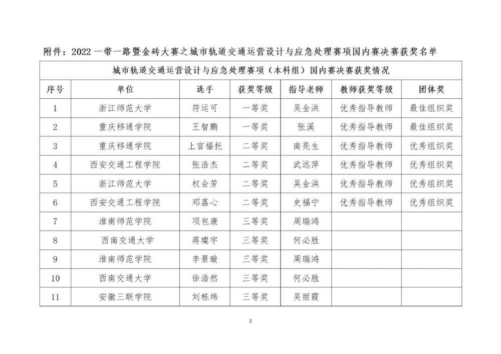 2022一带一路暨金砖国家技能发展与技术创新大赛之城市轨道交通运营设计与应急处理赛项(本科组)国内赛决赛表彰决定